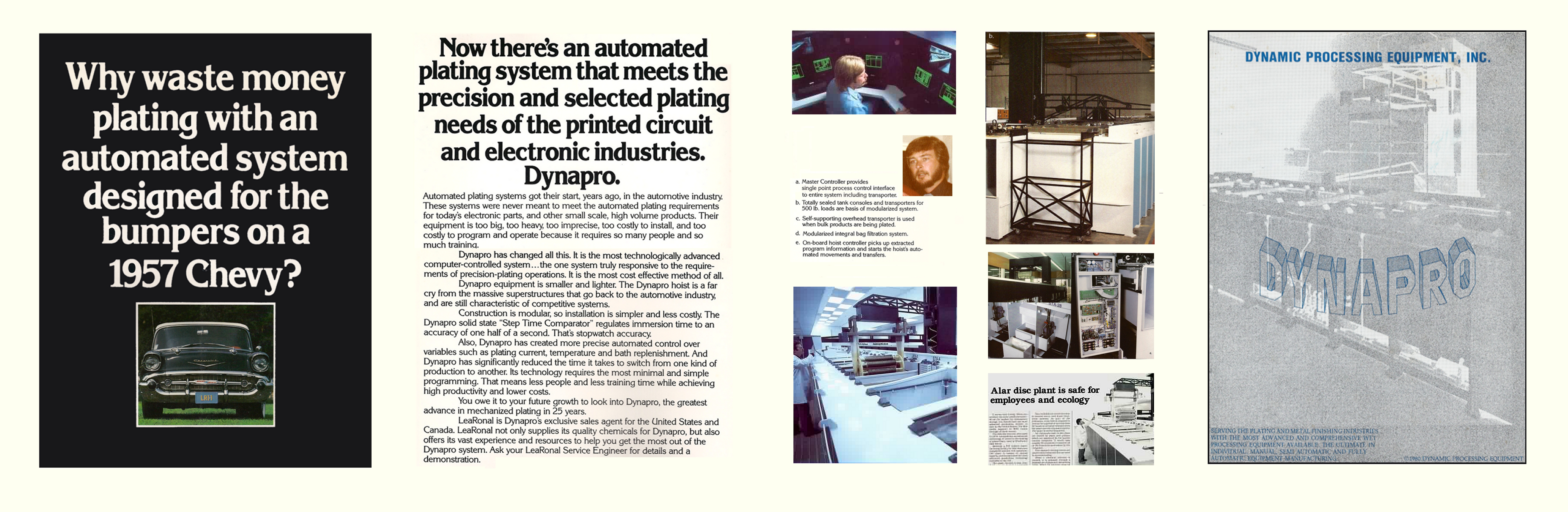 ![]() In 1979, I founded my first company: Dynapro. Marrying my past experience in semiconductor manufacturing (Signetics) with my engineering work on circuit board processing equipment (Morton-Thiokol), Dynapro applied microprocessors to the automation of sophisticated wet metal finishing processes. |